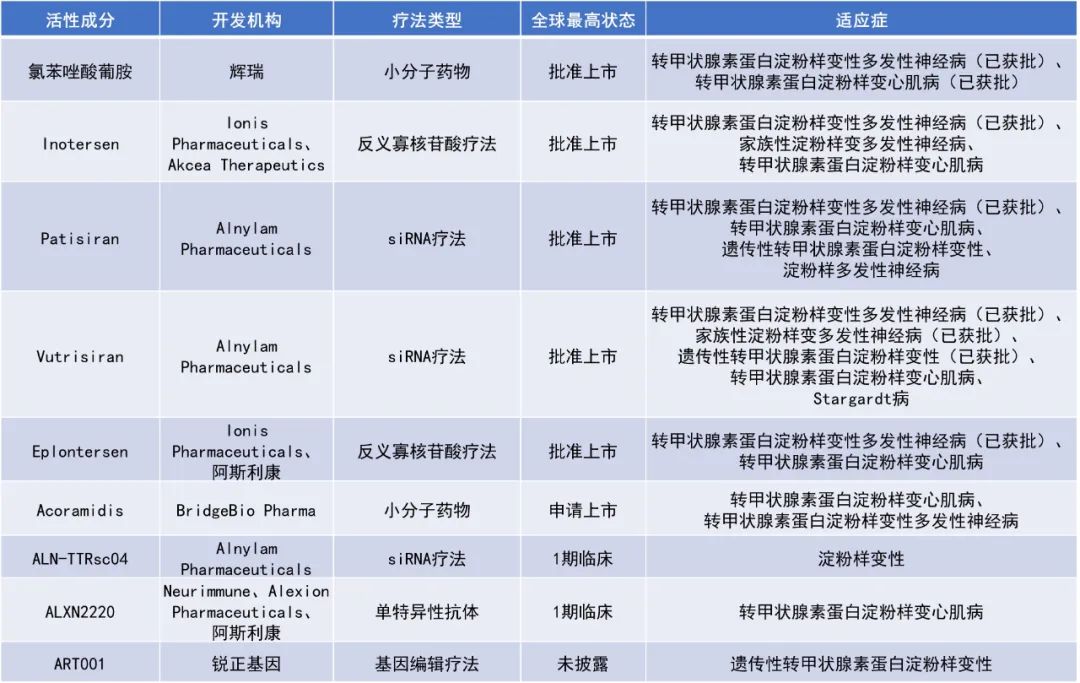 目前,全球有多种类型的TTR靶向疗法处于活跃研发阶段,包括反义寡核苷酸疗法、siRNA疗法、基因编辑疗法、抗体疗法和小分子药物。除了此次获批的eplontersen以外,已有4款疗法已在全球多个国家和地区获批上市,适应症涉及TTR介导的多种淀粉样变性疾病。
