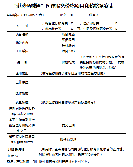 指定医疗机构需按通知附件要求的格式和内容向省医保局提交《“港澳药械通”医疗服务价格项目和价格备案表》及有关佐证材料以完成备案,并对其完整性、真实性负责,由指定医疗机构申请国家医保医用耗材编码和医疗服务价格项目编码。