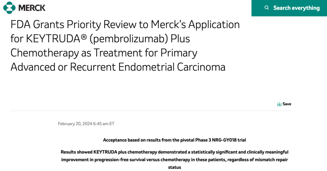 2 月 20 日,默沙东宣布,FDA 已接受 K 药的补充生物制品许可申请(sBLA)并授予优先审评资格,用于联合标准化疗(卡铂和紫杉醇)治疗原发性晚期或复发性子宫内膜癌患者。PDUFA 日期为 2024 年 6 月 21 日。