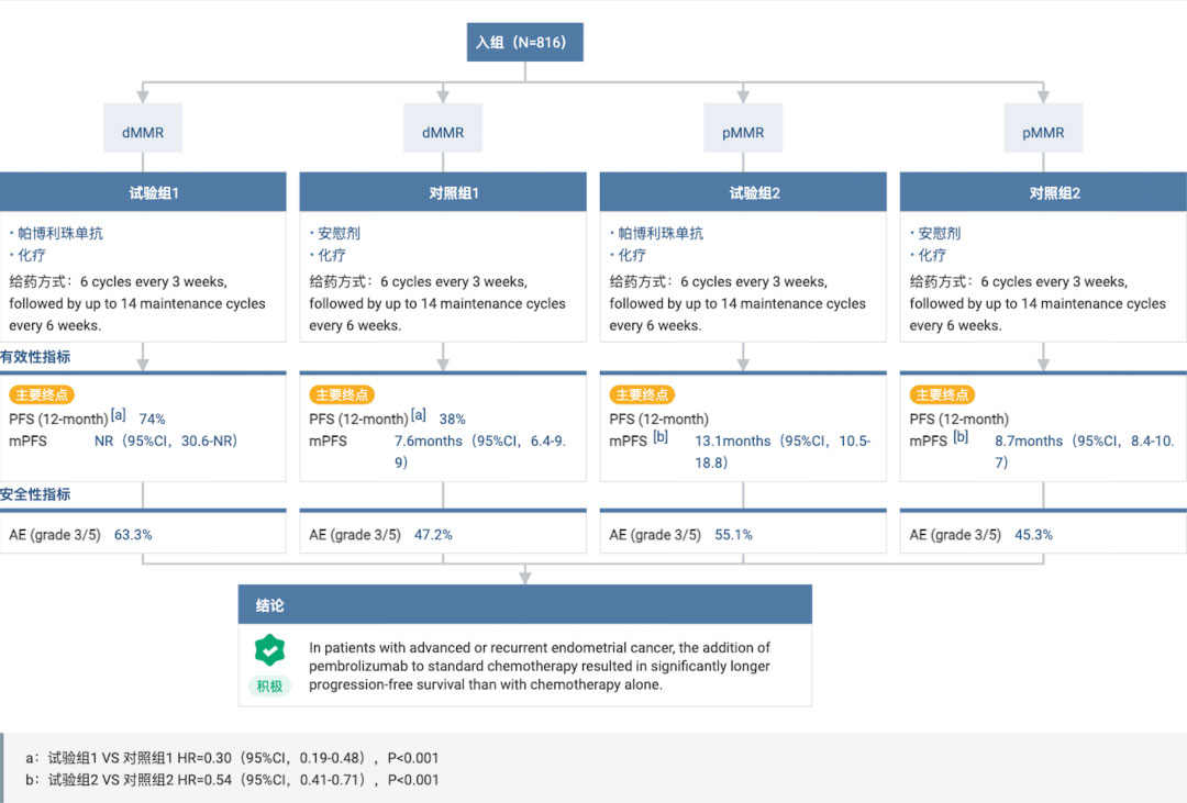 NRG-GY018 研究旨在评估 K 药联合化疗对照安慰剂联合化疗在错配修复功能正常(pMMR)型和错配修复缺陷(dMMR)型原发性晚期或复发性子宫内膜癌患者中的疗效和安全性。研究的主要终点为 PFS;次要终点包括安全性、总生存期等。