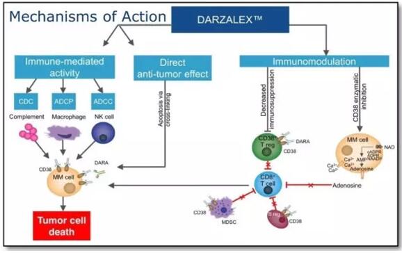 静脉注射用DARZALEX是世界上首个获批的CD38介导的溶细胞性抗体。CD38是一种在多发性骨髓瘤细胞中高表达的细胞表面蛋白。DARZALEX被认为可以通过多种免疫介导的作用机制来诱导肿瘤死亡:包括互补依赖性细胞毒作用(CDC)、抗体依赖性细胞介导的细胞毒作用(ADCC)和抗体依赖性细胞吞噬作用(ADCP)以及通过细胞凋亡(apoptosis)。该药物于2015年11月首次被FDA批准作为部分多发性骨髓瘤患者的单一疗法治疗,他们曾接受过PI或免疫调节剂治疗,或针对PI和免疫调节剂都是难治的。