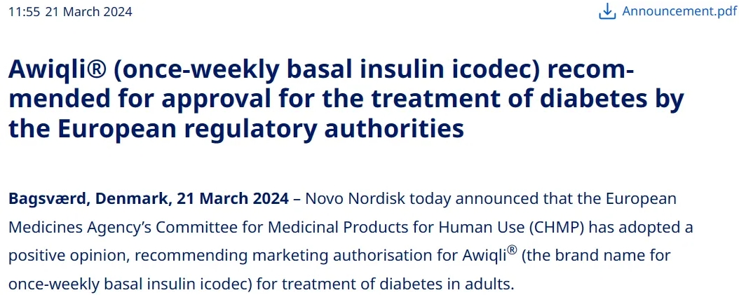 3月21日,诺和诺德宣布欧洲药品管理局人用医药产品委员会(CHMP)通过了一项积极的意见,建议批准Awiqli(每周一次基础胰岛素icodec)用于治疗成人糖尿病。