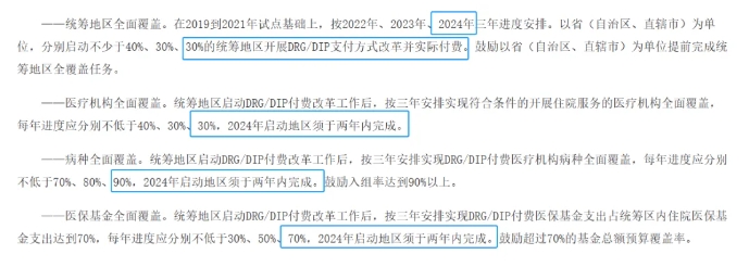 按照国家医保局2021年印发的《DRG/DIP支付方式改革三年行动计划》,到2024年底,全国所有统筹地区全部开展DRG/DIP支付方式改革工作;到2025年底,DRG/DIP支付方式覆盖所有符合条件的开展住院服务的医疗机构,基本实现病种、医保基金全覆盖。