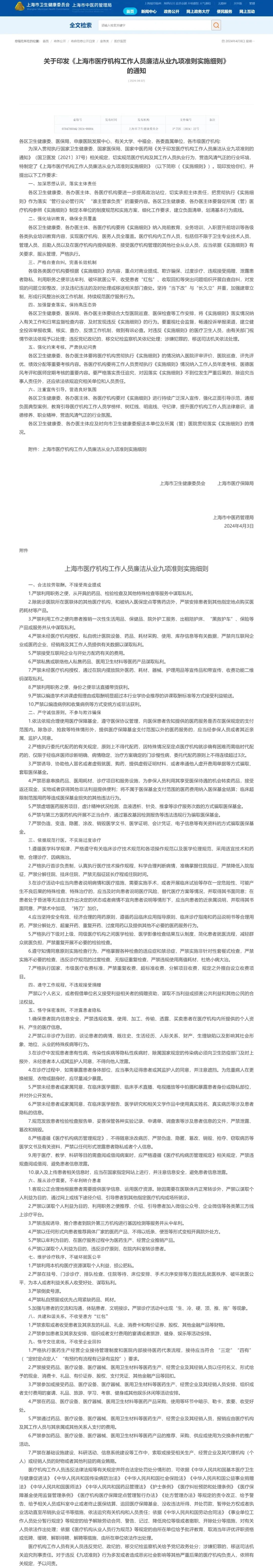 4月7日,上海卫健委发布《上海市医疗机构工作人员廉洁从业九项准则实施细则》。全文一共提到54处“严禁”,对医疗机构相关人员的执业行为进行详细要求。