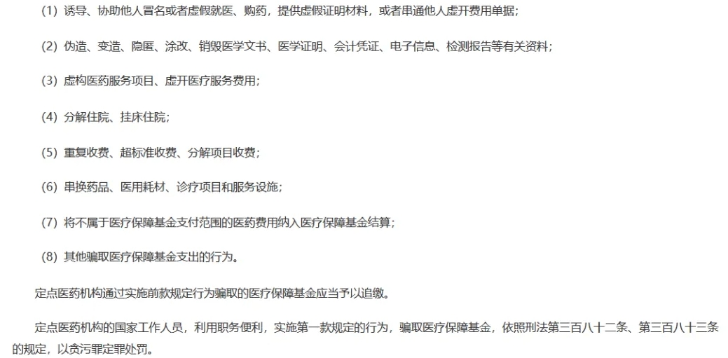 2024年3月,最高人民法院、最高人民检察院、公安部印发的《关于办理医保骗保刑事案件若干问题的指导意见》的通知提到,定点医药机构(医疗机构、药品经营单位)以非法占有为目的,实施下列行为之一,骗取医疗保障基金支出的,对组织、策划、实施人员,依照刑法第二百六十六条的规定,以诈骗罪定罪处罚;同时构成其他犯罪的,依照处罚较重的规定定罪处罚: