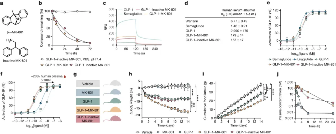 接下来,为了确定使用GLP-1-MK-801后观察到的有效体重减轻是由于GLP-1和MK-801之间的协同作用,还是由于GLP-1类似物的药代动力学性质的改变,研究人员将GLP-1-MK-801分子中的MK-801结构失活,得到由替代品组成的对照化合物GLP-1-inactive-MK-801。在证明GLP-1-MK-801和GLP-1-inactive-MK-801在体外表现出相当的药代动力学特性后,研究人员接下来在DIO小鼠中评估了它们各自的体内功效。结果显示,与单独使用GLP-1治疗相比,GLP-inactive-MK-801治疗没有产生额外的减肥效果,表明GLP-1-MK-801诱导的减重是由协同的、定点的GLP-1受体激动作用和NMDA受体拮抗作用驱动的。