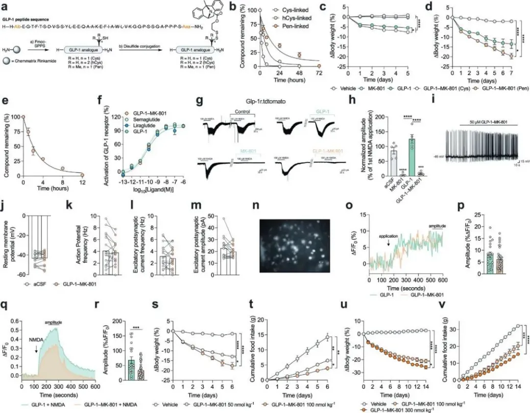 这种强强联合不仅可以增强NMDA受体在富含GLP-1受体的大脑食欲调控区域的治疗效果,还同时显著减轻了由MK-801非限制性作用引起的不良反应。
