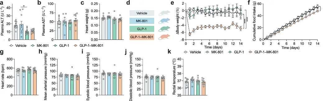最后,研究者评估了GLP-1-MK-801的不良反应,发现GLP-1-MK-801对心脏代谢健康存在改善作用,且无肝脏损伤迹象。并且,接受GLP-1-MK-801治疗的动物出现与GLP-1激动剂(恶心)和NMDA受体拮抗剂(体温过高和过度活动)相关的常见副作用的可能性较低、出现的严重程度较轻。这表明了GLP-1-MK-801药物较为安全。