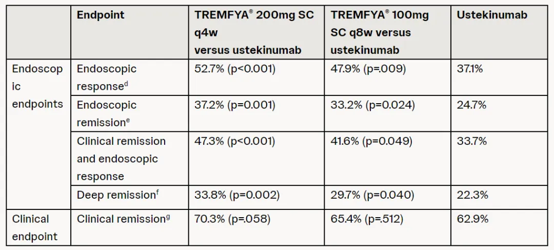 此外,在达成深度缓解(定义为达成临床缓解和内镜缓解)此一指标上,Tremfya高剂量与低剂量队列患者分别为33.8%(p=0.002)与29.7%(p=0.040),而Stelara组在此数值上为22.3%。