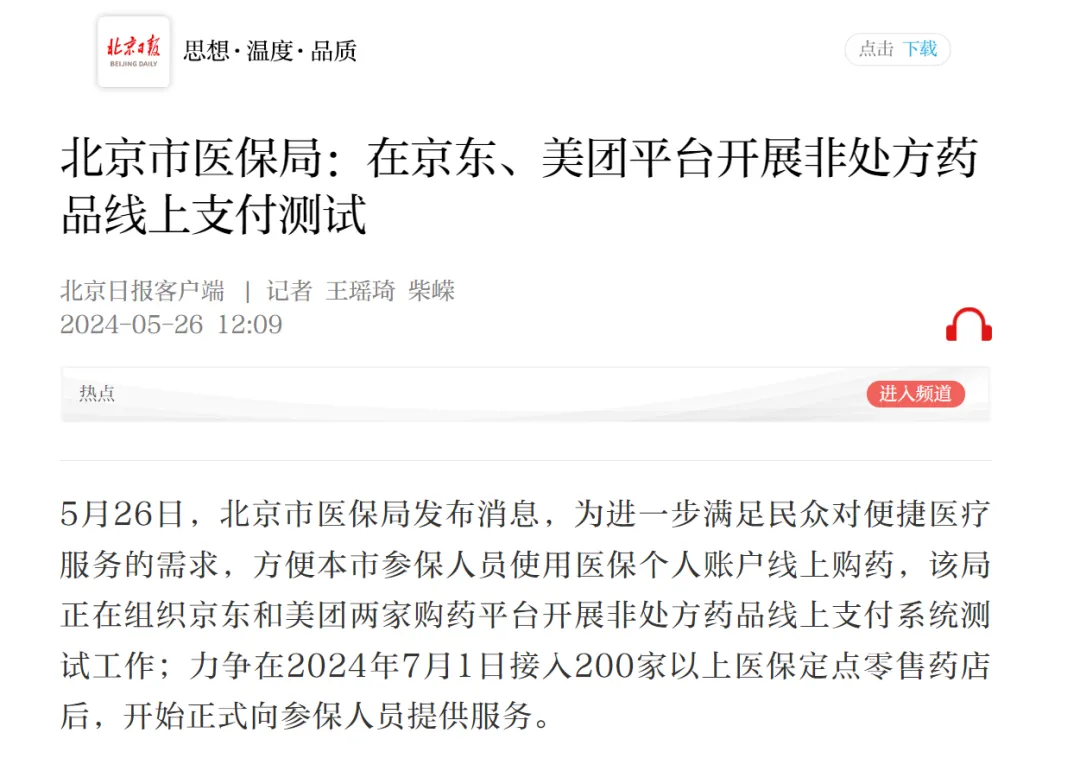 5月26日,北京市医保局发布消息,为进一步满足民众对便捷医疗服务的需求,方便本市参保人员使用医保个人账户线上购药,该局正在组织京东和美团两家购药平台开展非处方药品线上支付系统测试工作;力争在2024年7月1日接入200家以上医保定点零售药店后,开始正式向参保人员提供服务。