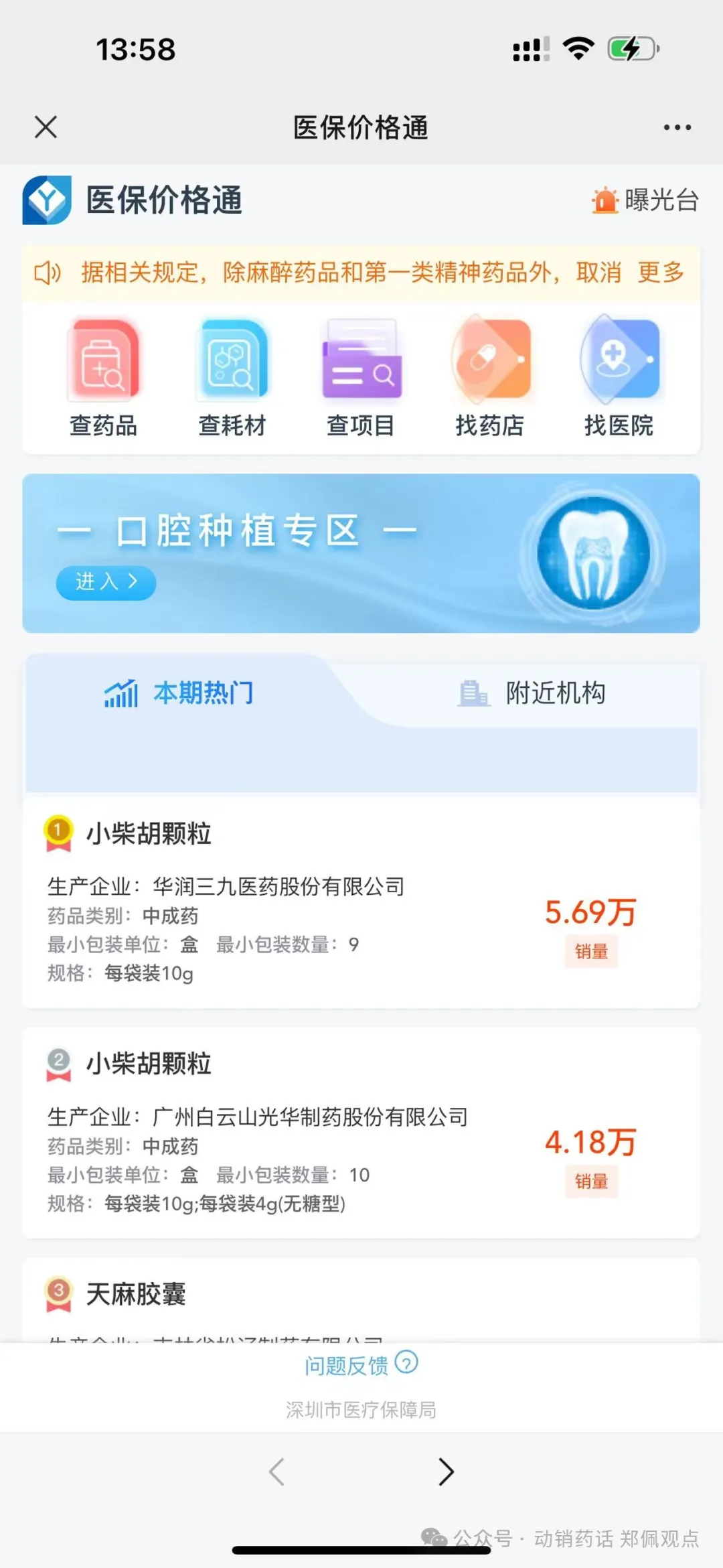 打开手机搜索“深圳医保”公众号,点击“掌上政务”,有“医保价格通”栏目,打开小程序以后,点击“查药品”输入药品名称,就可以获取药品在深圳市场的销售信息,包括医院均价、药店均价,在售医疗机构和药店,以及近三个月的销量等信息。