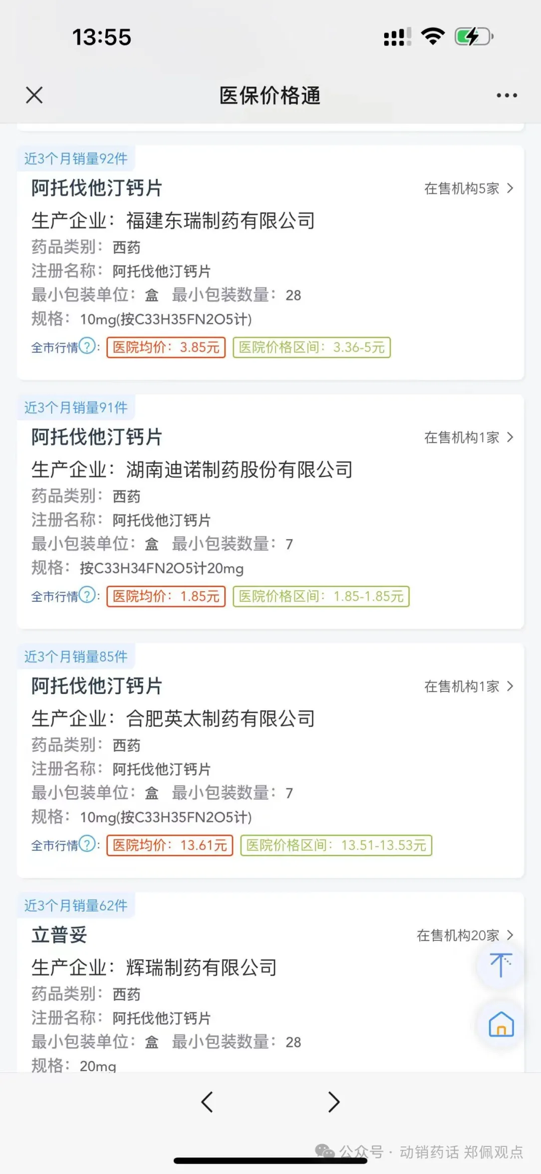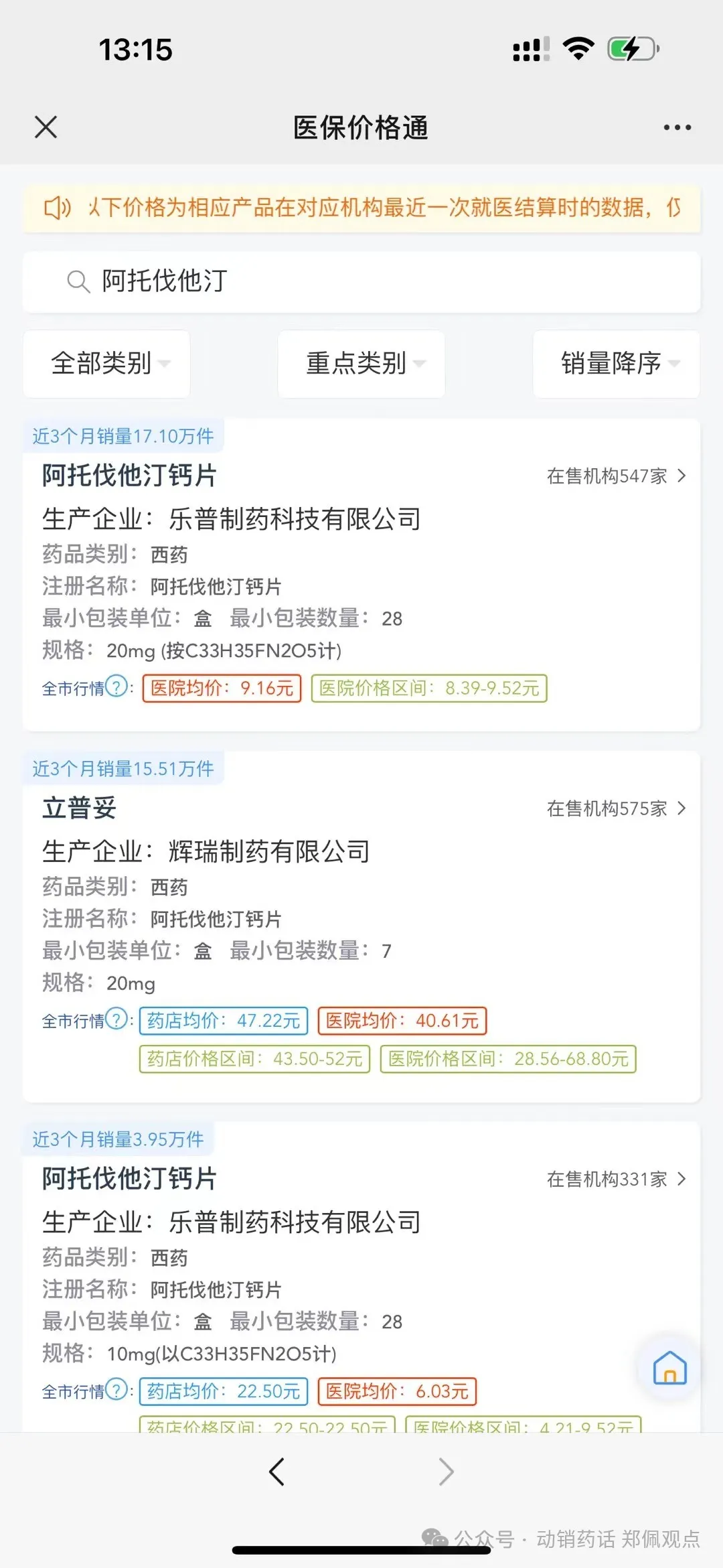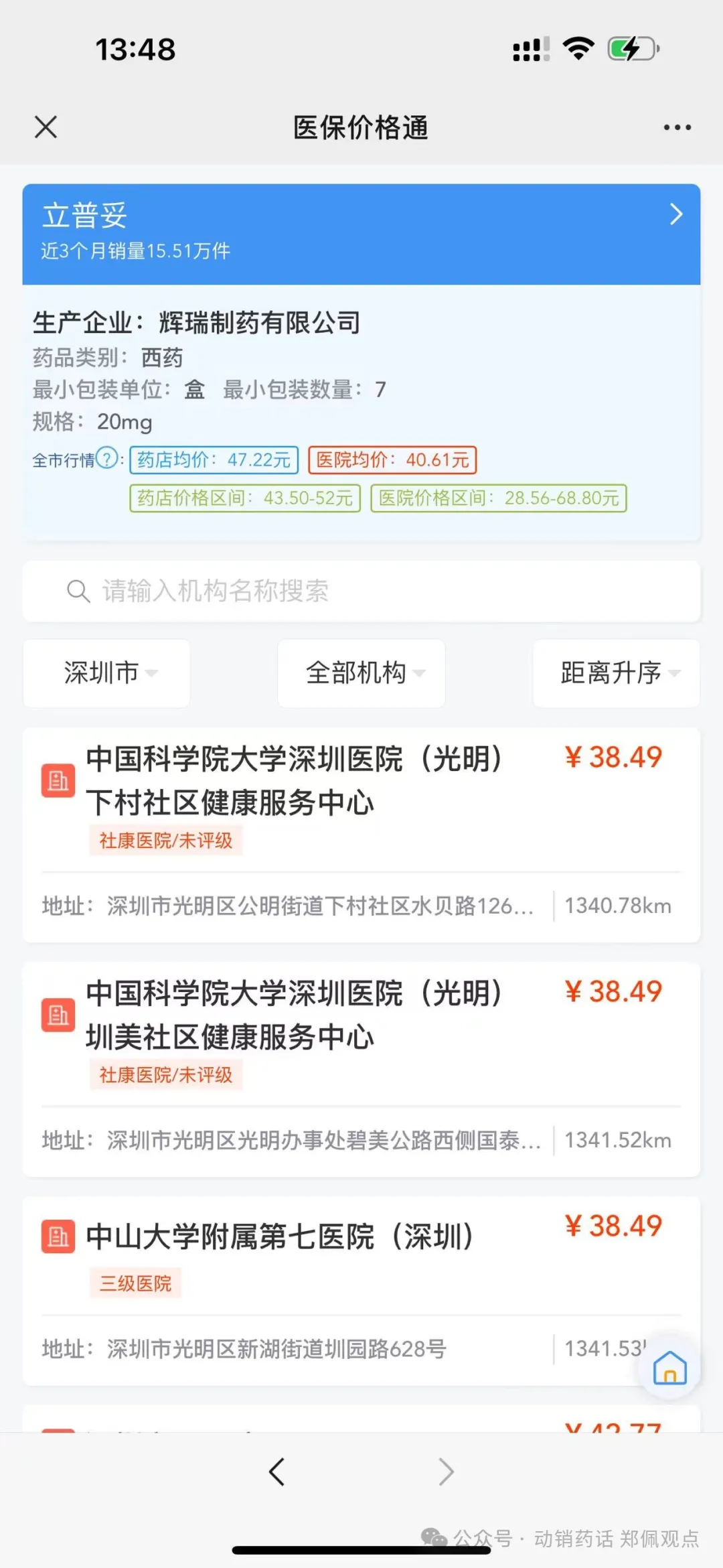 郑佩老师打开小程序后,输入阿托伐他汀,就跳出了各个厂家在深圳销售的情况。点开在售医疗机构后,销售的每个医院全部罗列。