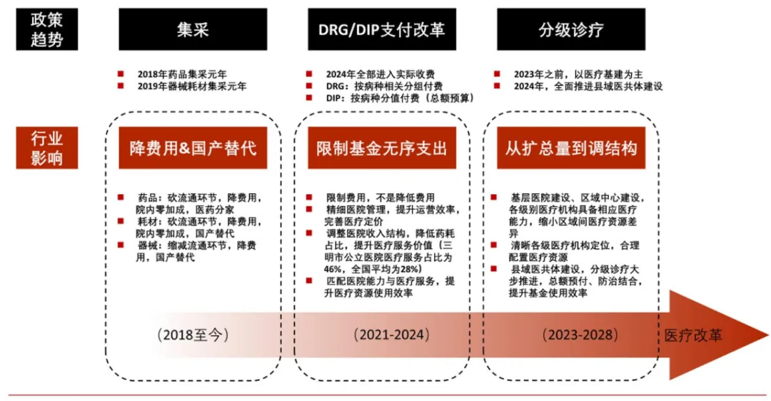 图:我国医改趋势,来源:中信证券第一拳药品集采:2018年是我国药物集采元年;一年之后,集采品类由药物拓展至器械耗材。虽然在推行集采方案的过程中,不少药企的利益受到了冲击,但从最终结果看:药物流通环节减少,药品价格明显降低,国产替代比例提升。第二拳DRG改革:全面集采之下,监管部门打出的另一张牌是全面推行DRG/DIP改革。推行DRG并非为了简单的降低支持,而是从根本逻辑上改变医保支出逻辑:由过去实际支出报销,改为按最终效果报销。第三拳医药反腐:2023年7月,国家卫健委会开展为期一年的全国医药领域腐败问题集中整治,从医院第一线杜绝医疗利益输送问题,整治国内医院的医疗乱象。中国的医疗保险基金是全球规模最大的单一医疗购买者,同时也是保障全国民众健康的核心力量。然而,随着人口老龄化问题的日益严重,一系列强有力的措施被采取,以精准有效地解决医保资金的滥用问题。值得注意的是,医保的应用并不局限于医院内部,连锁药店等院外市场也是医保资金支付的重要场所。实际上,将医疗服务与药品销售分离,即患者在医院接受治疗后,到药店购买药品的模式,可能是目前最理想的医药行业发展策略。但令人遗憾的是,连锁药店也长期存在诸多问题,包括非法使用医保资金、医保资金的滥用等,甚至在一些地区,非法使用医保资金已经变得司空见惯。医疗反腐的浪潮是否会波及到医药零售市场,这是一个值得探讨的问题。以下是我对这个问题的理解和分析: