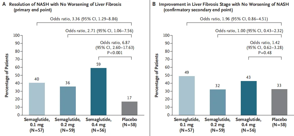 作为替尔泊肽的老对手,司美格鲁肽也早早涉足了MASH领域。2016年11月,诺和诺德启动了司美格鲁肽治疗MASH的II期临床试验(NCT02970942)。该研究共纳入了320名伴有肝纤维化(f1~f3)的NASH患者,随机按1:1:1:1接受司美格鲁肽0.1mg、0.2mg、0.4mg(每日一次皮下注射)或安慰剂治疗72周。