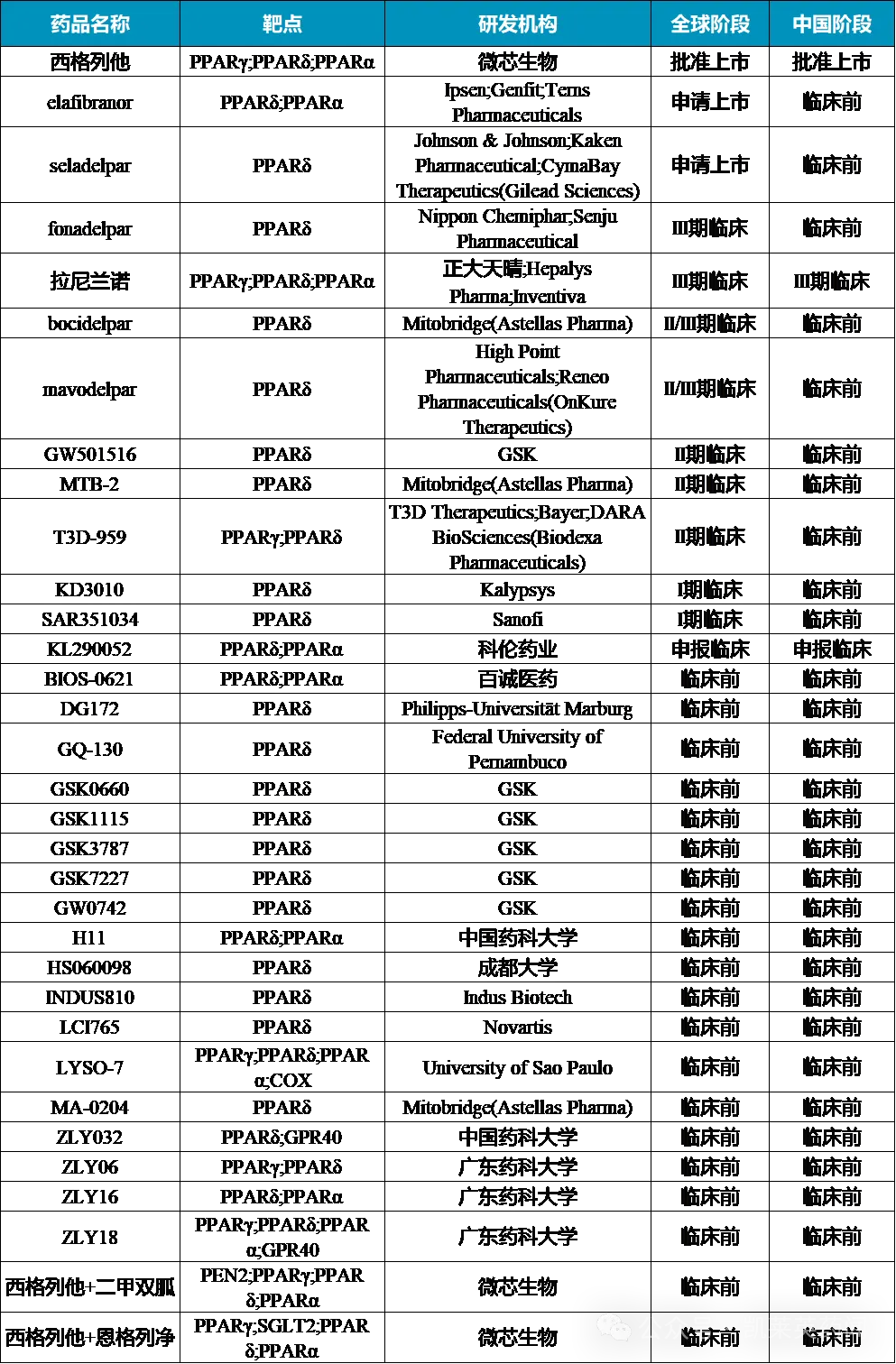 临床前数据表明,PPARβ/δ对调控胆汁酸合成、炎症、纤维化过程的多种基因有调节作用。据不完全统计,目前在研的PPARβ/δ激动剂约30余种。