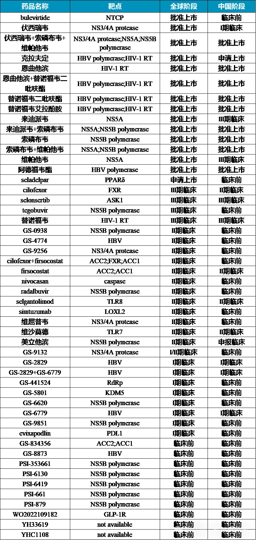 据不完全统计,目前吉利德在肝病领域共布局约50余款药物。