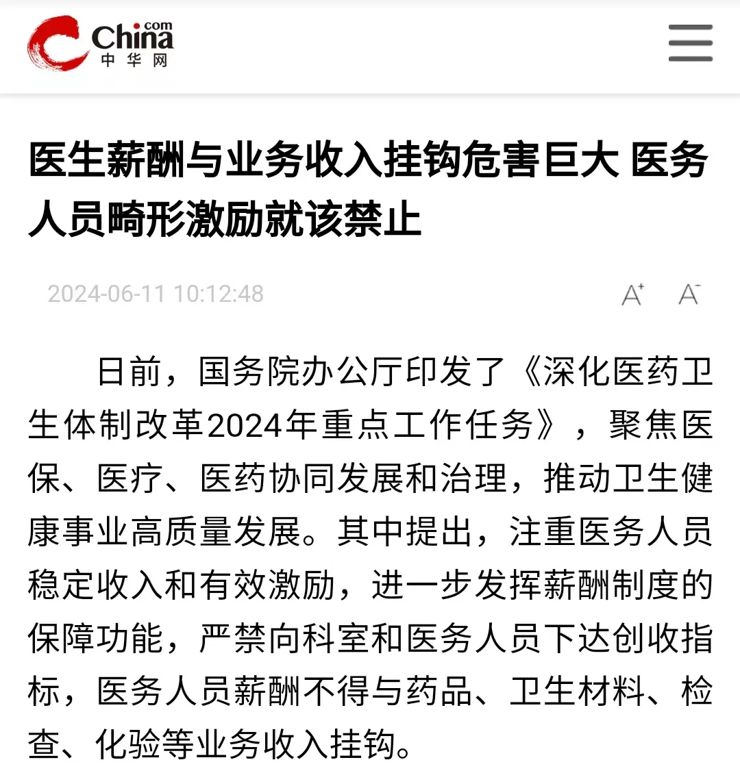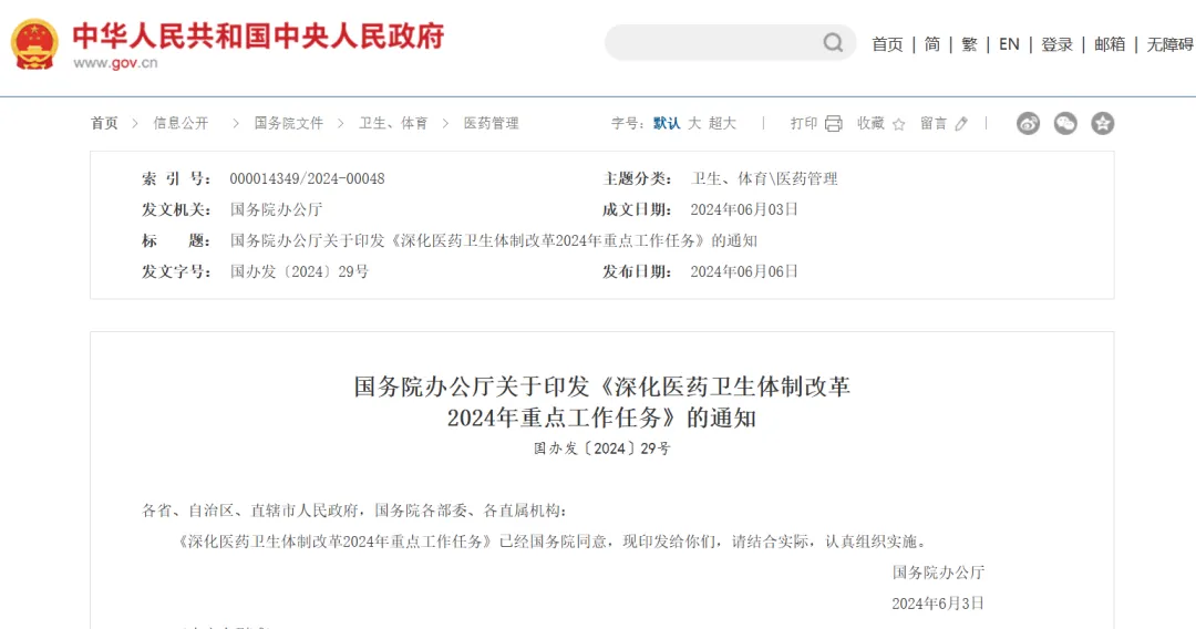 6月6日,很多医生还在科室忙碌中,在中华人民共和国中央人民政府网站上,一份标有国务院办公厅印发的《深化医药卫生体制改革2024年重点工作任务》(以下简称《任务》)的通知重磅来袭。