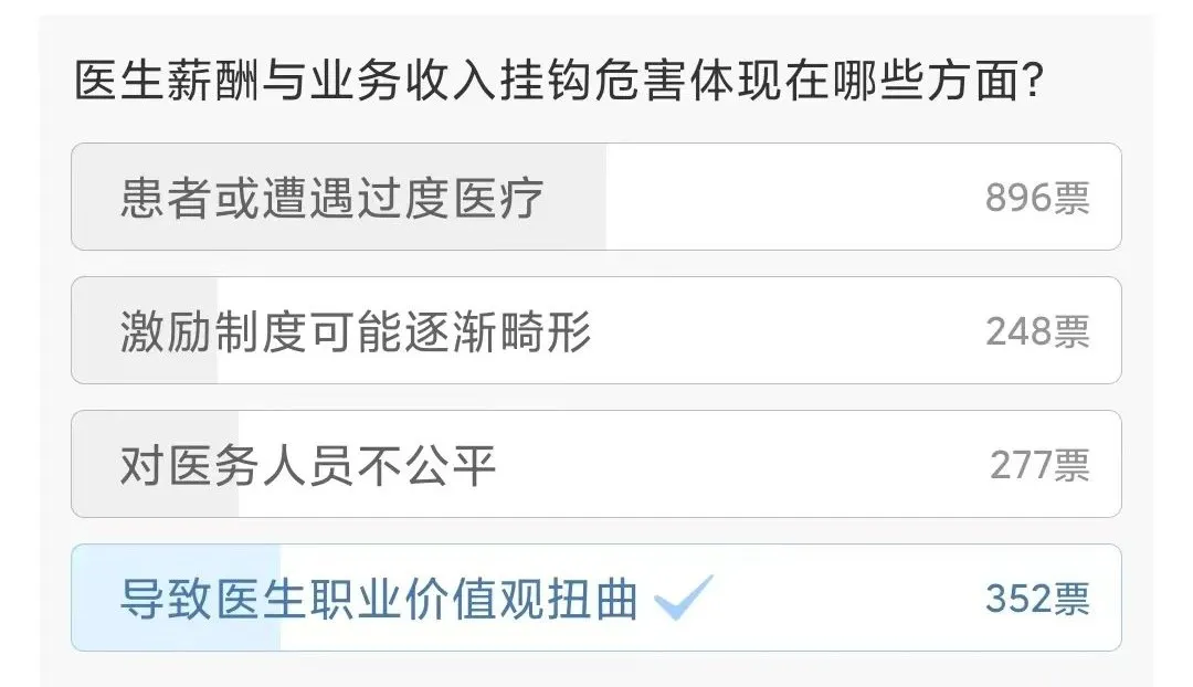 《南方都市报》则发表社论称,将公立医院医生的薪酬与业务收入挂钩,危害堪称巨大。对患者而言,有遭遇过度医疗的危险。当医生的薪酬与其开具的检查、治疗或药品销售等业务收入直接相关时,医生可能会有动力去推荐不必要的医疗项目,如多余的检查、昂贵的治疗方案或药物,从而增加患者的经济负担,进而损害医患之间的信任关系。对医务人员来说,一方面,这种畸形激励制度很不公平,因为有些科室和岗位也许不挣钱,但未必不重要,医务人员的付出也未必就少。另一方面,更可能导致医生职业价值观扭曲,使得一些医务人员从“以治病救人”为目标转向“以追求经济利益为主”,危害巨大。凤凰网更是在6月11日发起了投票,题目为“医生薪酬与业务收入挂钩危害体现在哪些方面?”近2000人给出了答案,其中50%的网友认为“患者或遭遇过度医疗”,20%的网友则认为“会导致医生职业价值观扭曲”。