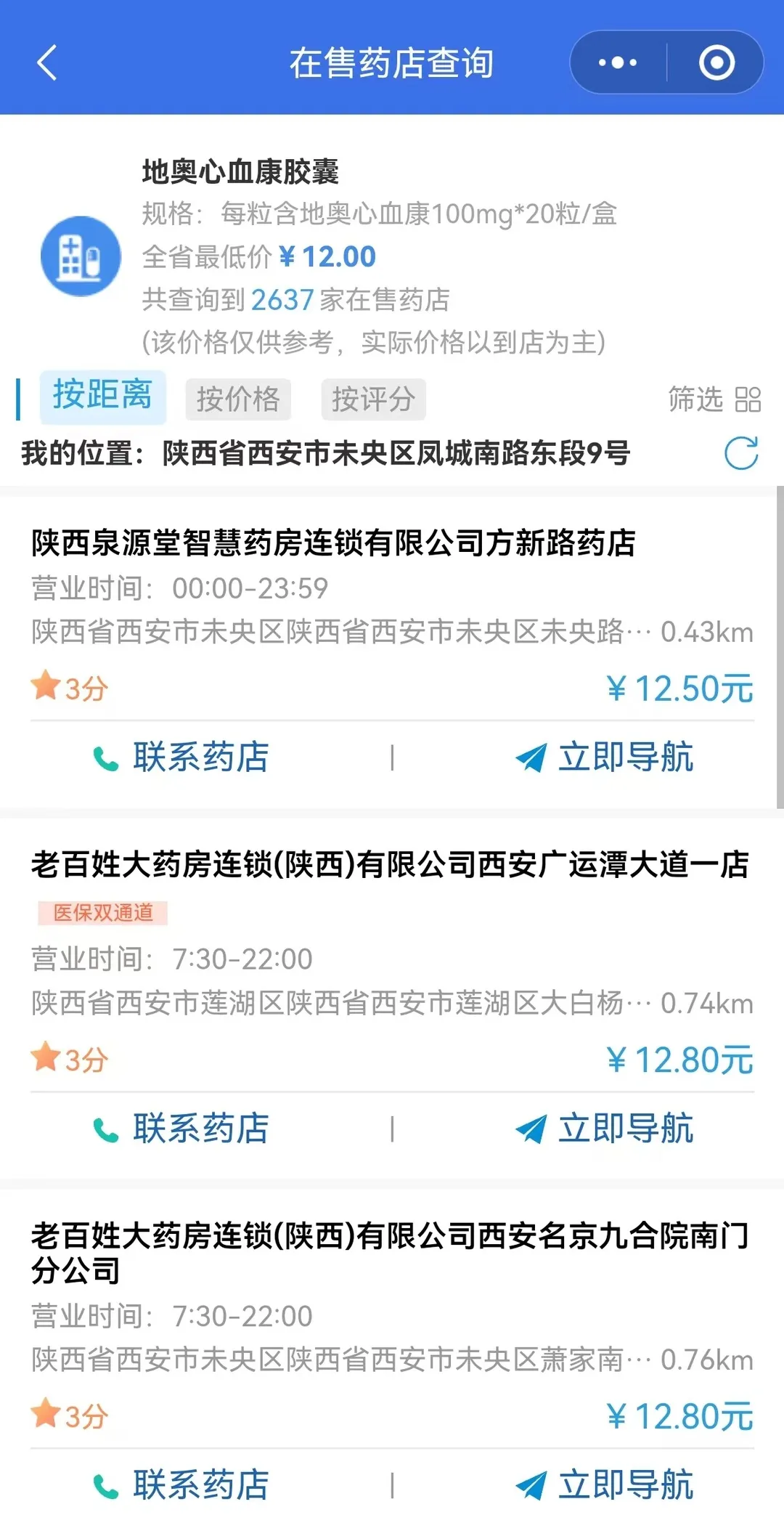 可按距离、价格或评分筛选展示相关药店,进而选择电话咨询或者导航去药店购买。