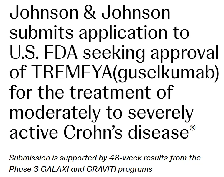 6月20日,强生宣布古塞奇尤单抗(商品名:Tremfya)皮下注射(SC)剂型诱导治疗中重度活动性克罗恩病(CD)成年患者的III期GRAVITI研究取得了积极结果。基于该研究和两项头对头III期研究(GALAXI 2和GALAXI 3)的积极结果,强生已向FDA递交古塞奇尤单抗治疗CD的上市申请。