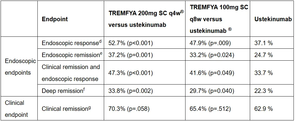 结果显示,在内镜应答终点方面,古塞奇尤单抗组优效于乌司奴单抗组。