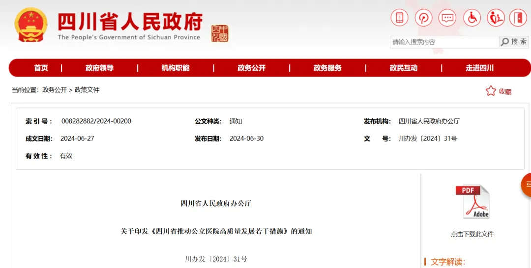 6月30日,四川省人民政府办公厅印发《四川省推动公立医院高质量发展若干措施》(简称《措施》),提出落实各级政府办医管医责任、完善医院内部管理体系和机制、加快推进医疗服务价格改革、深化人事和薪酬制度改革等10项措施。