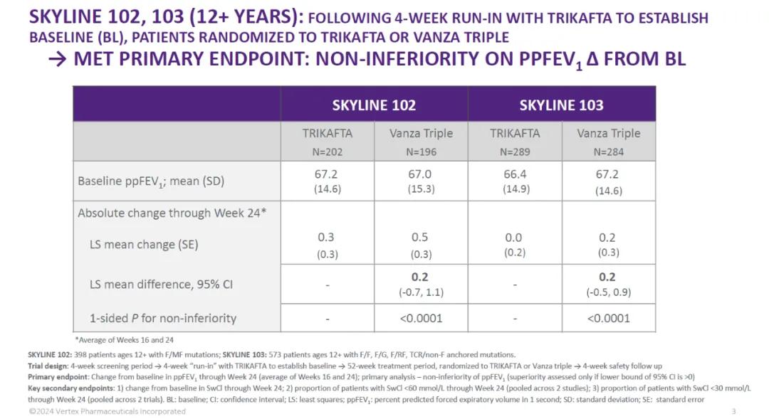 ▲Vanza三联疗法在SKYLINE 102和SKYLINE 103中达到主要终点(图片来源:Vertex公司官网)