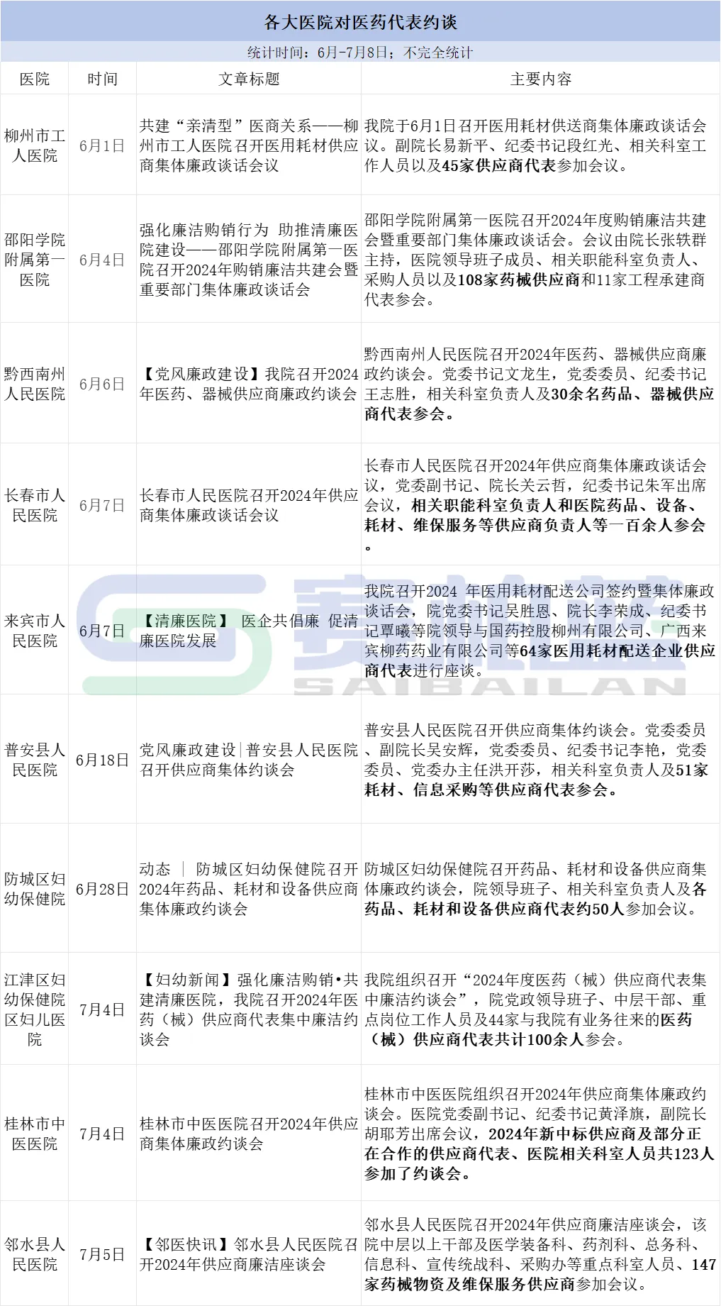 据赛柏蓝不完全统计,自六月份以来,已经有10家医院约谈药械供应商代表,被约谈代表合计超800位。