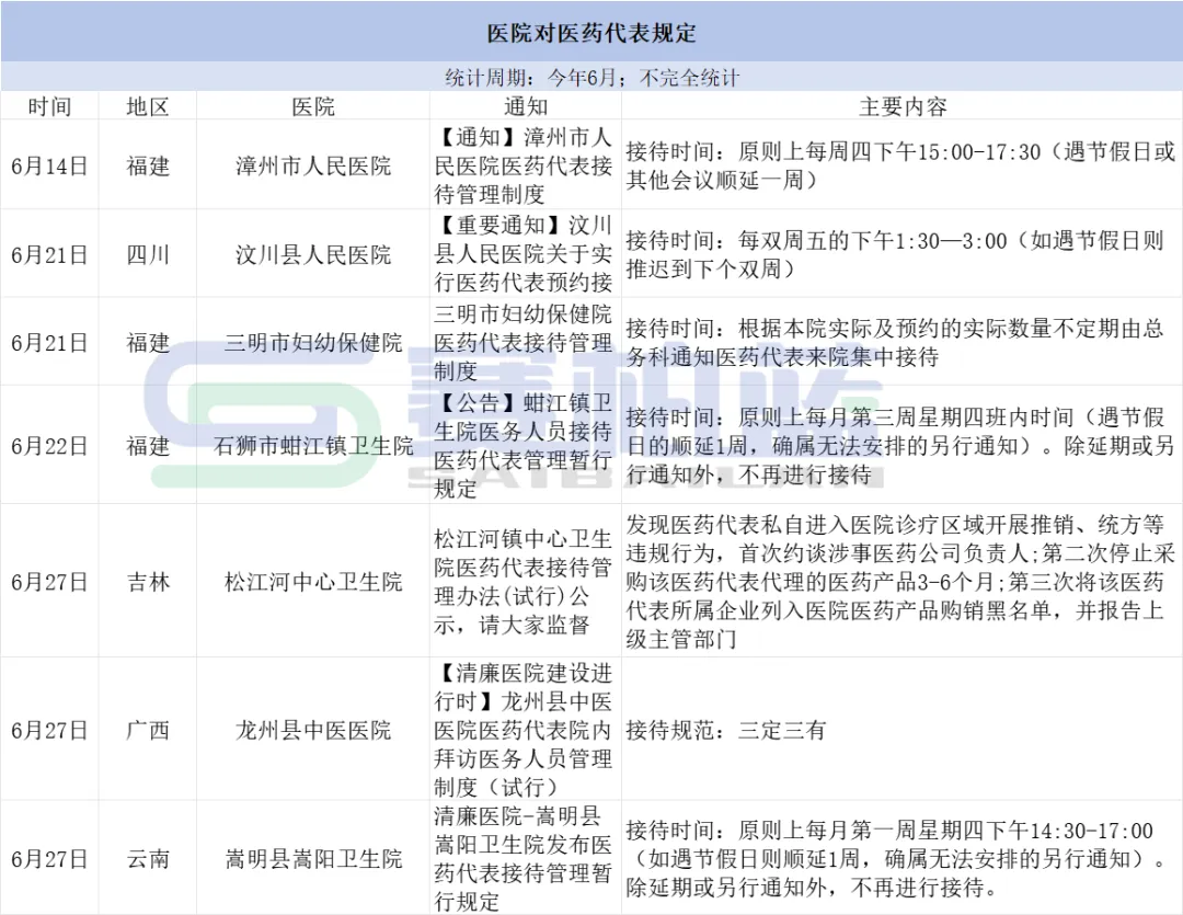此外,仅在今年6月,已经有7家医院发布医药代表进院的通知(详见文末),对医药代表进院作出规范。