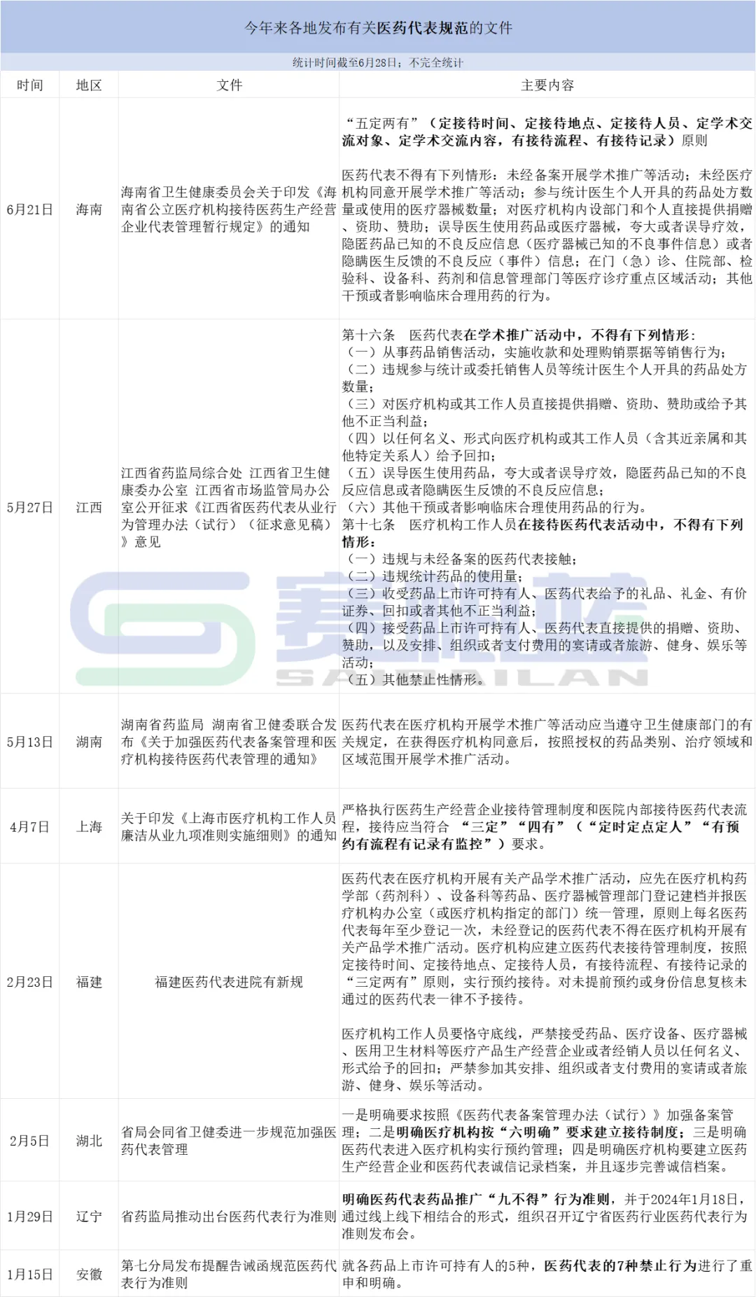 据赛柏蓝统计,截至7月8日,全国已经有8个省份发布关于医药代表规范的相关文件,包括海南、江西、上海、福建、湖北、辽宁、安徽、湖南(详见文末)。