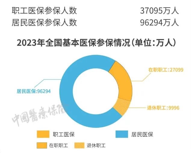 截至2023年底,职工医保参保37095万人,比上年增加852万人,增长2.3%。职工医保统账结合和单建统筹参保人员分别为34525万人、2569万人,和上一年相比,前者上升,后者下降,说明完整参保的结构有所改进,整体保障水平有所提升。另一方面,截至2023年底,居民医保参保96294万人,剔除重复参保等因素,参保率保持相对稳定的水平。