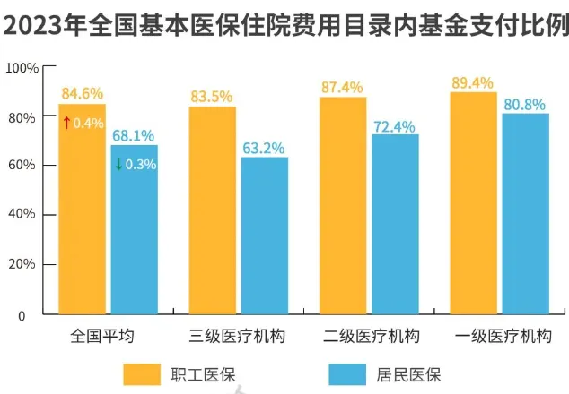 2023年,职工医保住院费用目录内基金支付比例84.6%,三级、二级、一级及以下医疗机构支付比例分别为83.5%、87.4%、89.4%。居民医保住院费用目录内基金支付比例68.1%,三级、二级、一级及以下医疗机构支付比例分别为63.2%、72.4%、80.8%。这一结构与上一年度基本持平。不同等级医院之间的支付比例实施差异,其初衷是有效实现分级诊疗,激励普通病患者到基层医疗机构开展首诊。但同时要考虑到,支付比例拉大差距也会带来隐患,大病患者的就医负担就会相对加重,进而影响其医疗服务的利用效率。因此居民医保不同医院支付比例结构有待进一步优化完善。