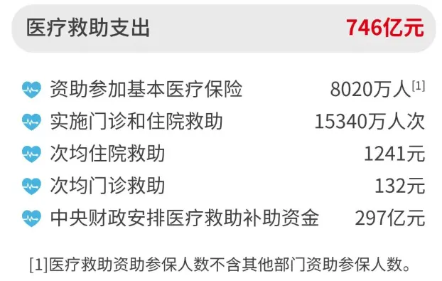 2023年,全国医疗救助支出746亿元,为2019年以来增幅最大年份,增长率达到19%。医疗救助基金资助8020万人参加基本医疗保险,实施门诊和住院救助15340万人次,各项医保综合帮扶政策惠及农村低收入人口就医1.86亿人次,减轻农村低收入人口医疗费用负担1883.5亿元。分别比上一年度增加28%和26%,有效控制了灾难性医疗支出对家庭经济生活的负面影响。