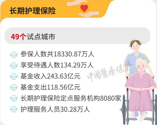 2023年,49个试点城市参加长期护理保险人数共18330.87万人,享受待遇人数134.29万人,基金支出118.56亿元,分别比上一年度增长了7.9%、11.2%和13.6%。长期护理保险定点服务机构达到8080家,护理服务人员30.28万人。