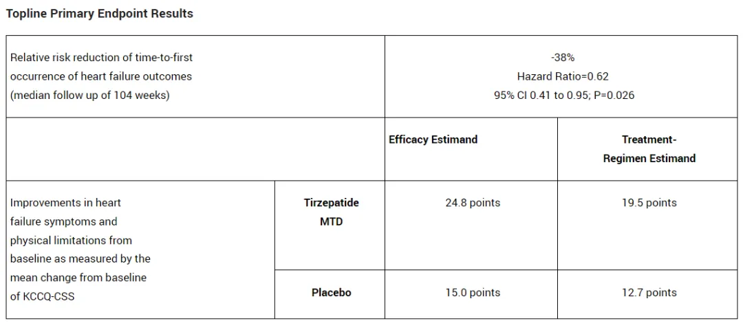 分析显示,与安慰剂相比,tirzepatide在两个主要终点方面均表现出统计学上显著的改善,即降低发生心力衰竭事件风险(包含心力衰竭紧急就诊或住院、强化口服利尿剂治疗或心血管死亡),以及通过堪萨斯城心肌病问卷(KCCQ)临床总结评分(CSS)衡量,显示患者的心力衰竭症状和身体限制获得改善,详细结果请见下表。