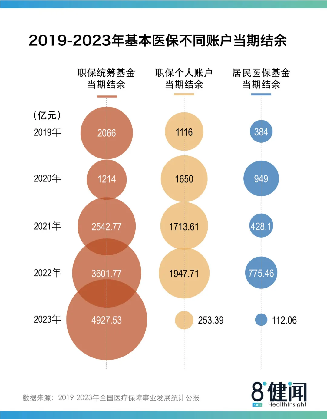 2023年,居民医保当期结存仅有112.06亿元;相较而言,2023年职工医保统筹基金当期结余有4927.53亿元。