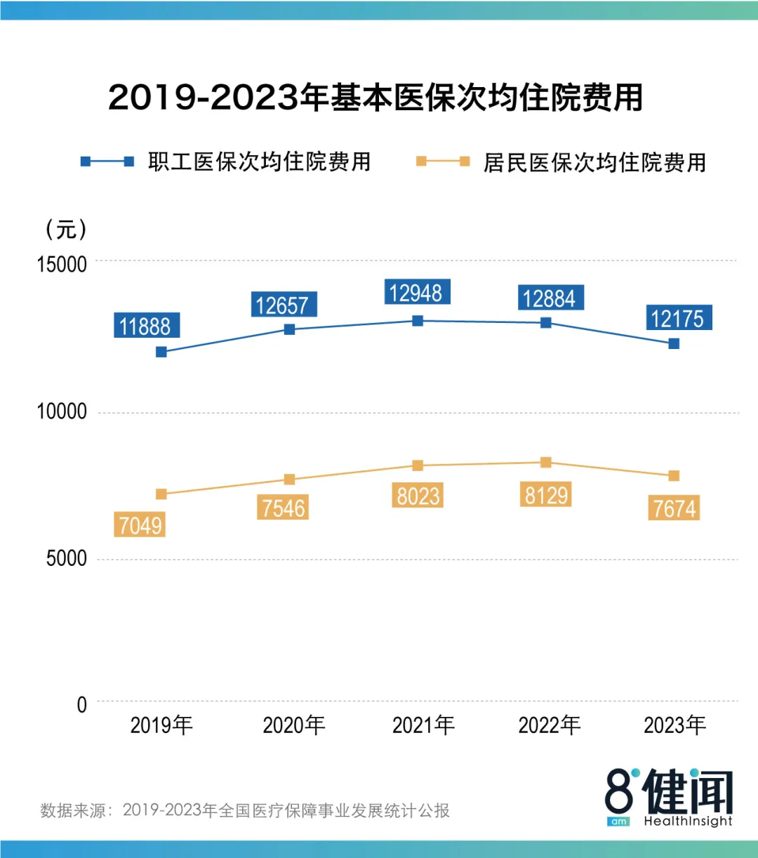 根据历年《医保统计公报》显示,职工医保住院率从2022年的17.6%上涨到2023年的21.86%,居民医保住院率从16.3%上涨到20.7%。而在2019年,这一数字分别是18.7%和16.6%。
