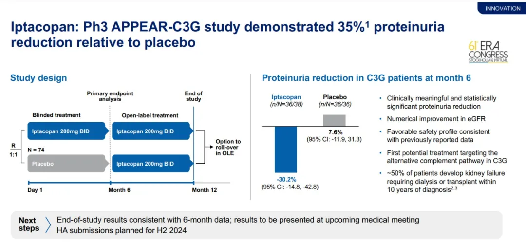 此前公布的3期临床试验APPEAR-C3G中期结果显示,在C3肾小球病(C3G)患者中,Fabhalta与安慰剂相比,在治疗6个月时将患者的蛋白尿水平降低35%。诺华公司在2024年第二季度财报中表示,Fabhalta在治疗12个月时的疗效与6个月一致,具体数据将在近期的医学会议上公布。诺华预计在2024年下半年递交Fabhalta治疗C3G的监管申请。