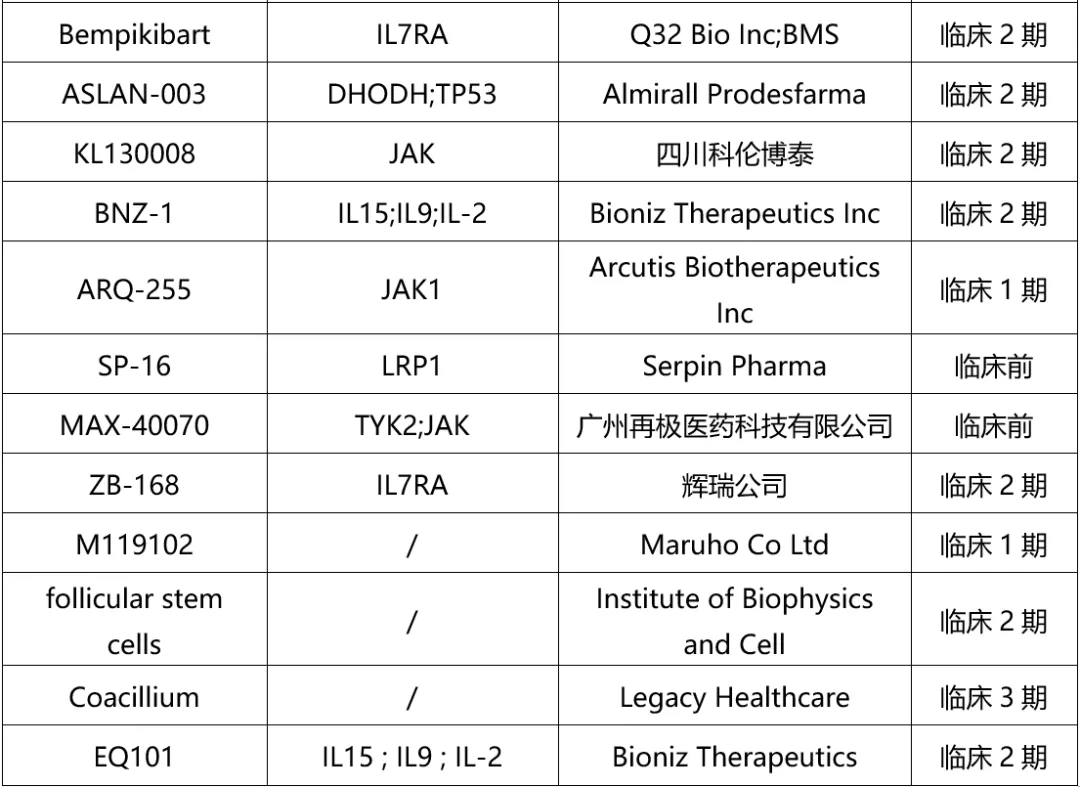 表1. 斑秃药物全球在研药物