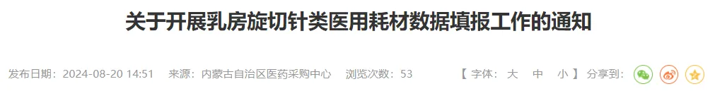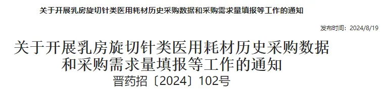 近日,四川、山西、内蒙古等地宣布开展乳房旋切针类医用耗材数据填报等工作,涉及历史采购数据和采购需求量。