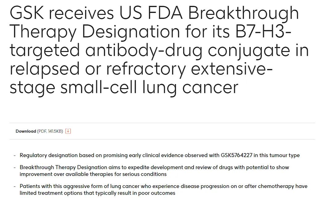 GSK公司今日宣布,FDA已授予其在研B7-H3靶向ADC药物GSK5764227(HS-20093)突破性治疗认定,用于治疗广泛期小细胞肺癌(ES-SCLC)患者,该患者在铂基化疗(复发或难治性)期间或之后病情进展。突破性疗法认定旨在加速药物的开发和审查,这些药物具有治疗严重疾病的潜力,并且初步临床证据可能表明比现有疗法有实质性改善。