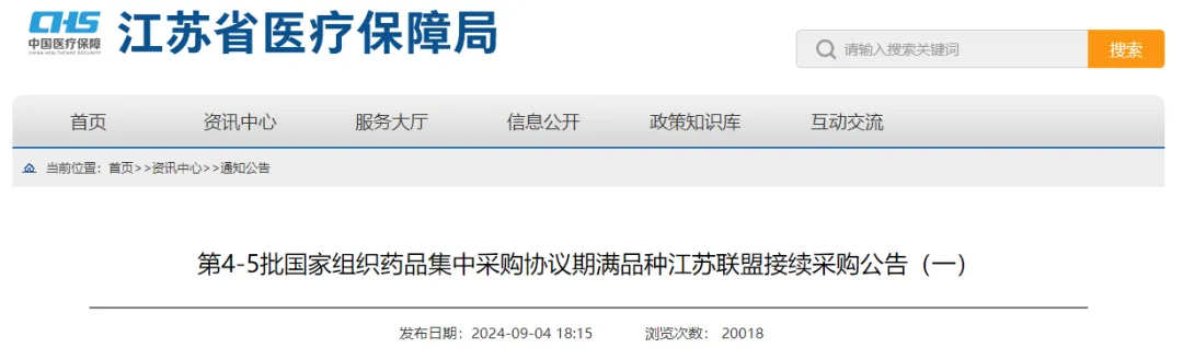 9月4日,江苏省医保局发布《第4-5批国家组织药品集中采购协议期满品种江苏联盟接续采购公告(一)》,该省将按照国家医保局有关要求,江苏、安徽、湖北、广西、重庆、四川、贵州、云南、陕西、甘肃、青海等11个省份组建省际联盟,对第4-5批国家集采协议期满的47个药品开展接续采购工作。