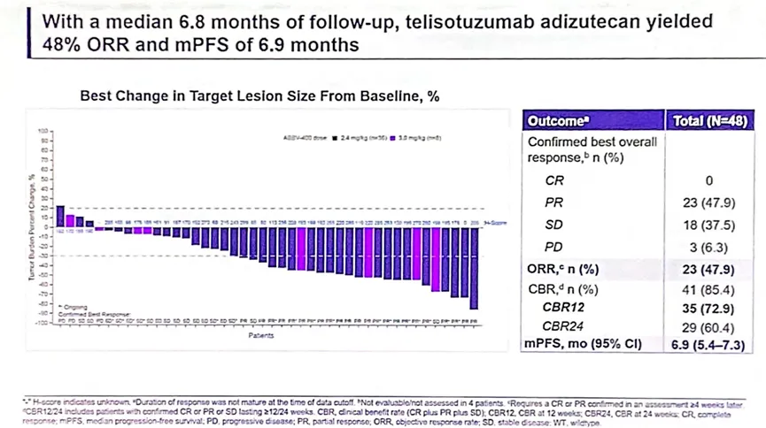 结果显示:中位随访时间为6.8个月,ORR为47.9%,中位PFS为6.9个月,中位治疗持续时间为5.6个月。在cMET高表达患者中观察到更优的疗效,在≥25%细胞ICH3+患者和≥50%细胞ICH3+患者中均表现出显著优于2L+ NSQ EGFR WT NSCLC患者(48 pts)的疗效(ORR分别为60.0%和77.8%)。