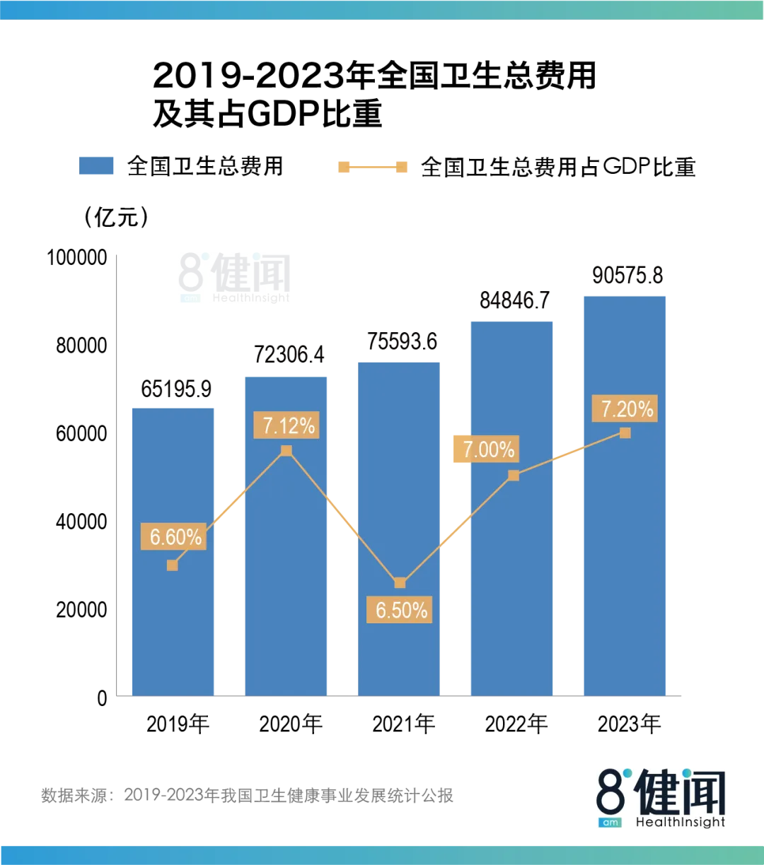 2023年的数据显示,我国卫生总费用已突破9万亿元,而卫生总费用占GDP比重,在经历两年徘徊后再创新高,达到7.2%。