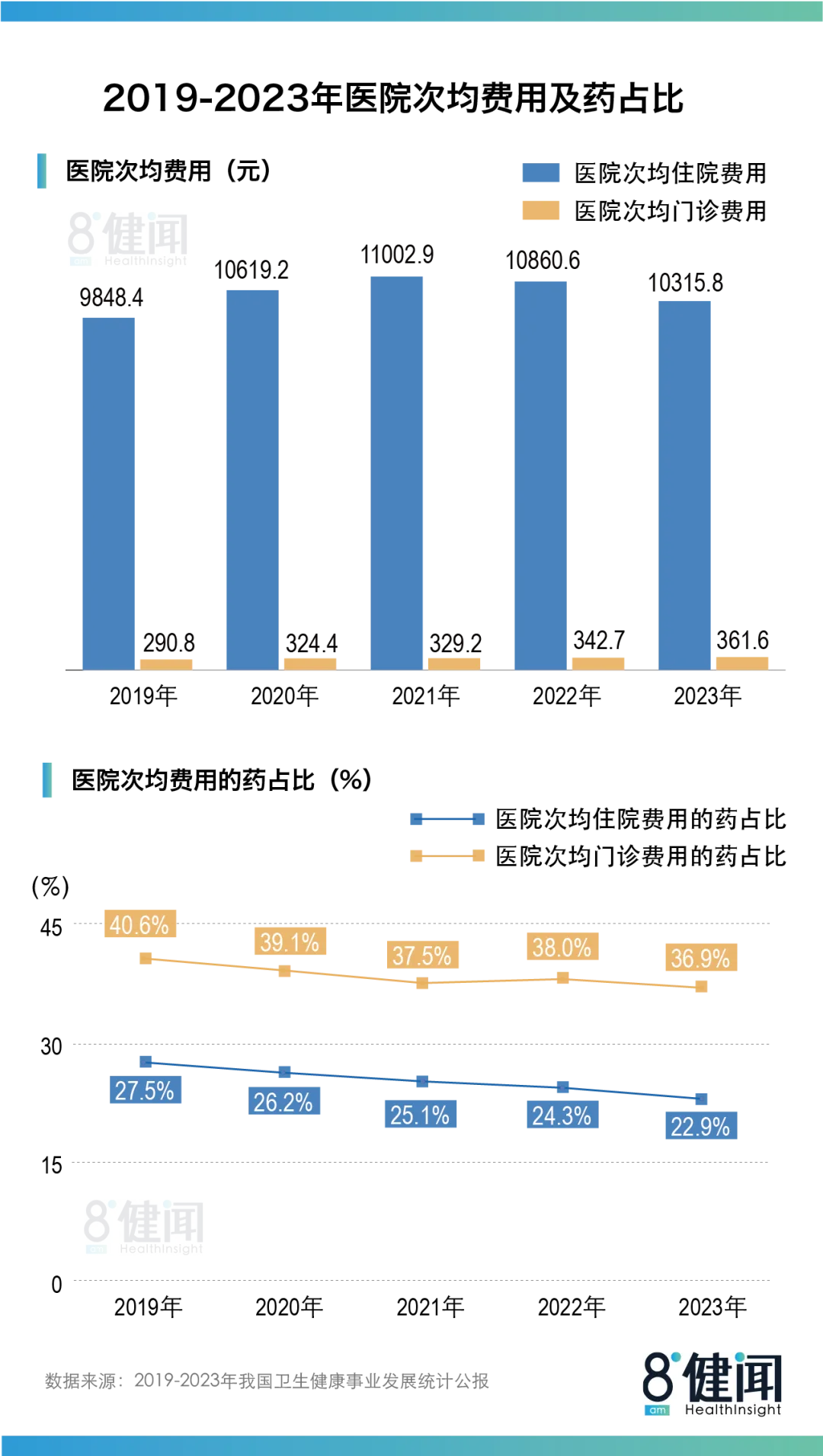 自2021年起,医院次均住院费用连续两年下滑,2023年降至10315.8元;而医院次均门诊费用却持续5年增长,由2019年的290.8元提高到2023年的361.6元。