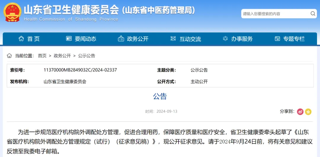 近日,山东卫健委发布《山东省医疗机构院外调配处方管理规定(试行)(征求意见稿)》(以下简称征求意见稿),共二十条。