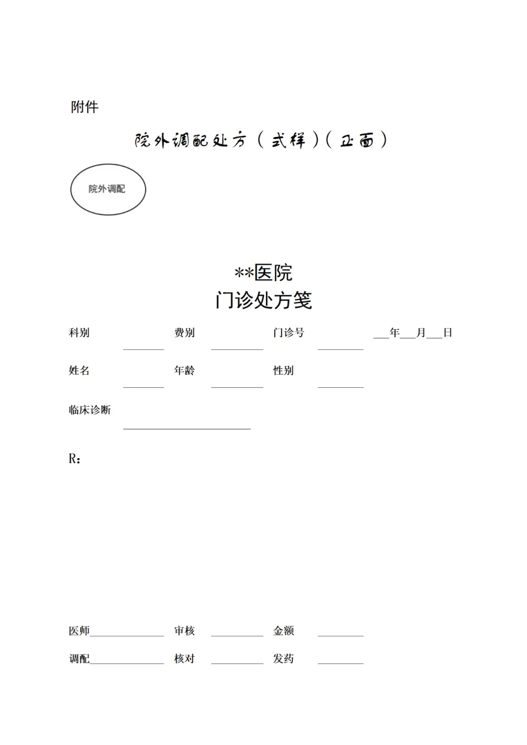 第六条 省卫生健康委统一制定全省医疗机构外配处方格式,医疗机构按照规定的标准和格式执行(外配处方笺式样见附件)。省医疗保障局按有关要求积极推进定点医疗机构电子处方流转。