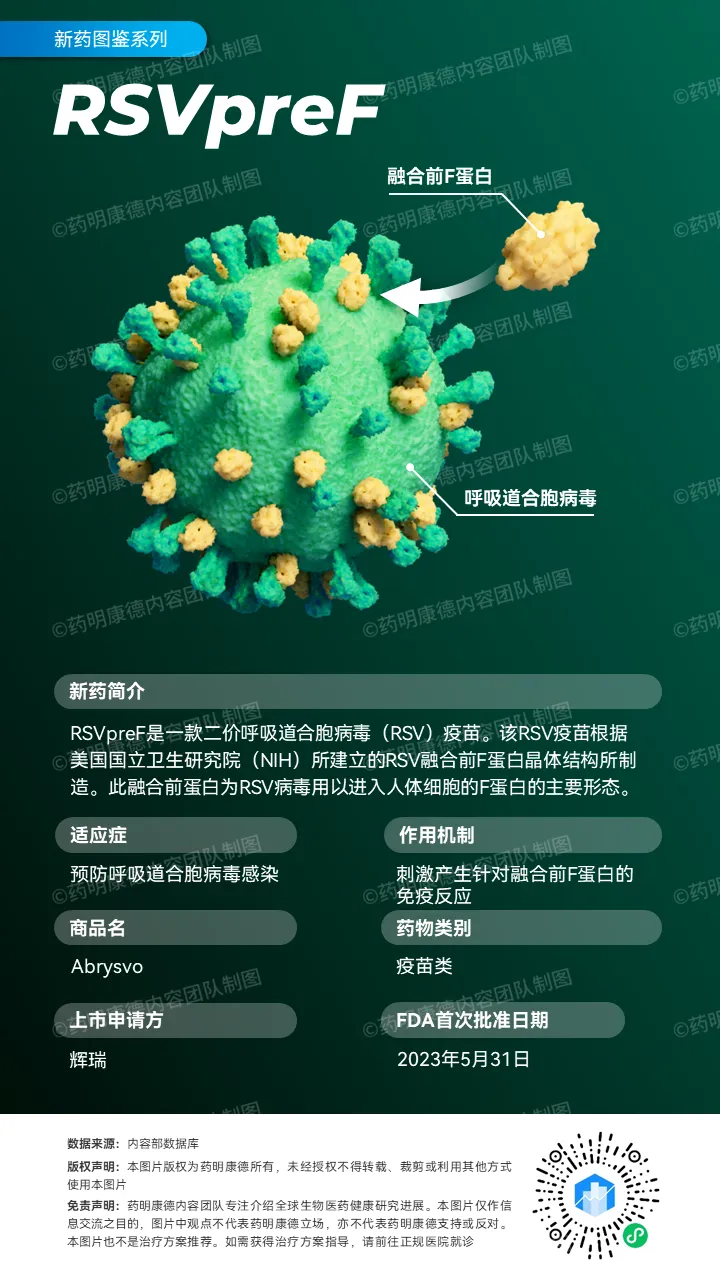 Abrysvo是根据RSV融合前(prefusion)F蛋白晶体结构所制造,不含佐剂。此融合前形态是RSV病毒用以进入人体细胞的F蛋白的主要形态。过往研究显示靶向此融合前蛋白形态可以有效阻断病毒感染。此双价疫苗含有等量、分别来自A与B病毒亚型的重组RSV融合前F蛋白。去年5月底,FDA批准该疫苗上市,用于预防60岁及以上成人由RSV引起的急性呼吸道疾病和下呼吸道疾病。同年8月,FDA再度批准该疫苗注射至怀孕32至36周妇女以产生主动免疫的方式,用于预防出生至6个月婴儿由RSV引起LRTD和严重LRTD。