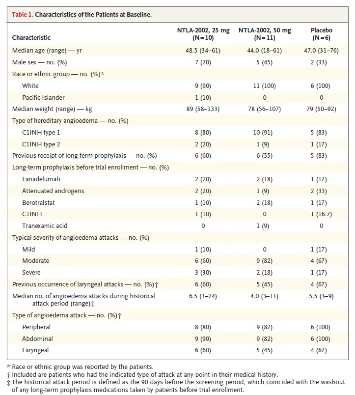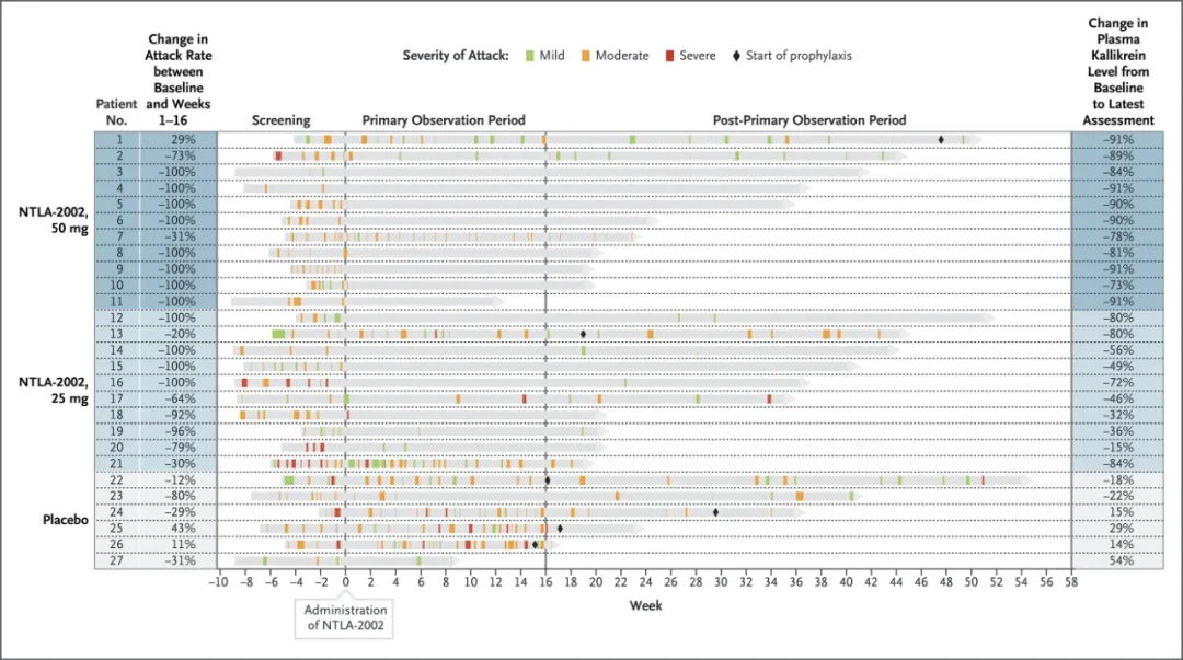 NTLA-2002的II期研究是一项随机、双盲、安慰剂对照研究,旨在评估NTLA-2002的疗效、安全性、药效学和药代动力学特征。研究共招募了27名参与者,这些参与者被分配到NTLA-2002 25 mg(n=10)、NTLA-2002 50 mg(n=11)或安慰剂组(n=6)。分析的数据截止日期为2024年4月4日,当时第25例患者完成了16周的主要观察期。