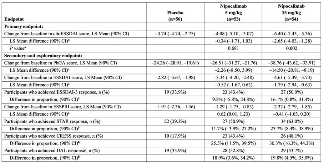 该BTD的授予主要基于2期DAHLIAS研究的数据。该研究评估了nipocalimab在中度至重度SjD成人患者中的疗效和安全性。该试验共有163名SjD患者入组(5 mg/kg nipocalimab组,n=53;15 mg/kg nipocalimab组,n=54;安慰剂组,n=56),各组患者的基线特征相似。试验的主要终点ClinESSDAI是一个专门针对SjD的综合量表,评估11个器官系统领域的疾病活动,包括皮肤、肺、肾、关节、肌肉、周围神经系统(PNS)、中枢神经系统(CNS)、血液、腺体、淋巴结肿大和淋巴瘤等组分,分数越高,症状越严重。